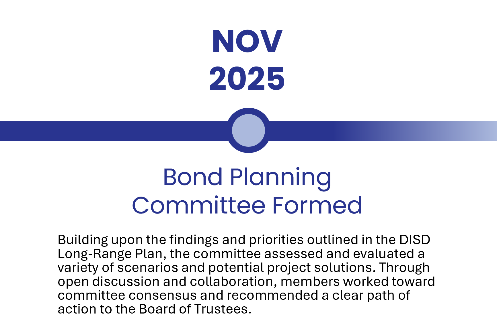 Decatur ISD has been engaged in an ongoing effort to address district facilities. Following previous bond elections, the district paused to take a deeper look at long-term priorities through the work of the Long-Range Planning Committee. That effort provided a foundation for continued planning and community involvement. Building on those findings, the Bond Planning Committee was formed to carry the work forward and develop a recommendation to the Board of Trustees that aligned with the district’s long-term vision.