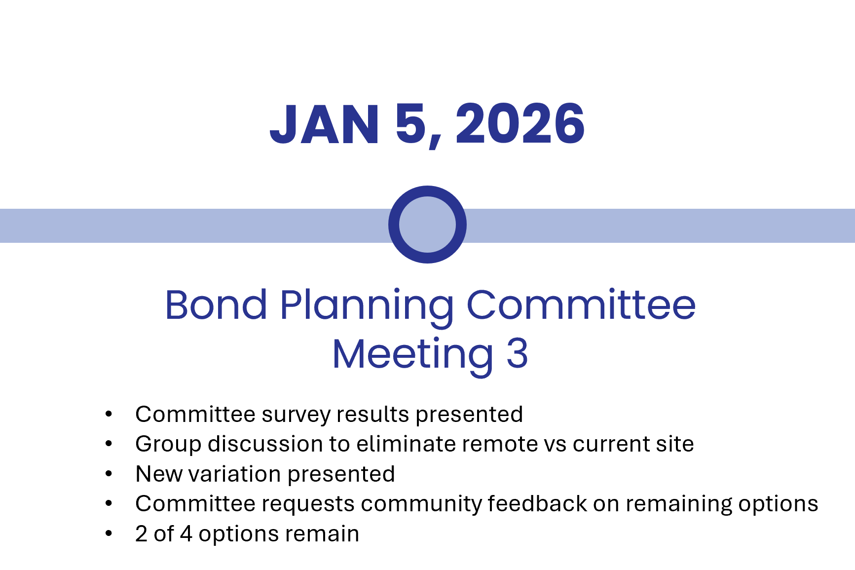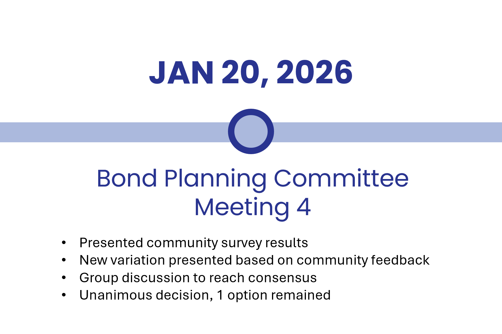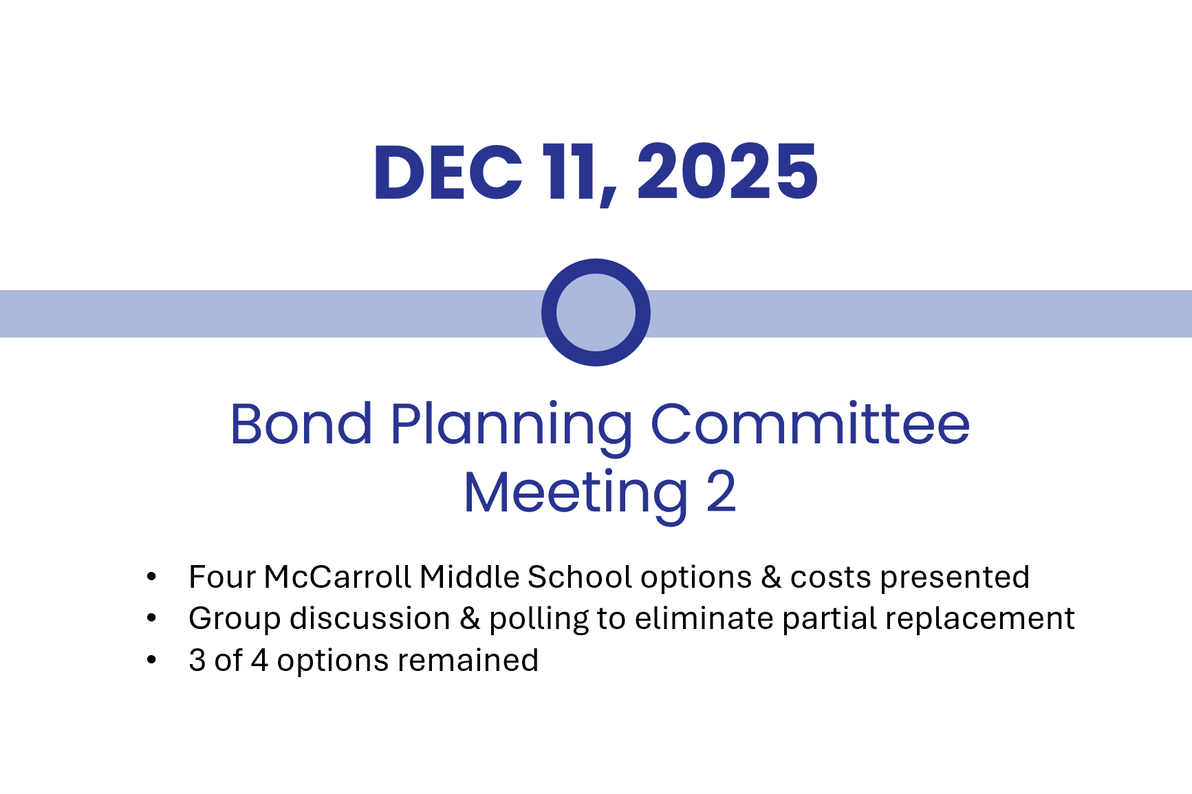 This bond package was developed through a community-driven process that included input from the Bond Planning Committee comprised of a cross-section of the community, along with feedback from the broader community. Together, those perspectives contributed to the evolution of the initial plan and helped define the final plan for McCarroll Middle School.