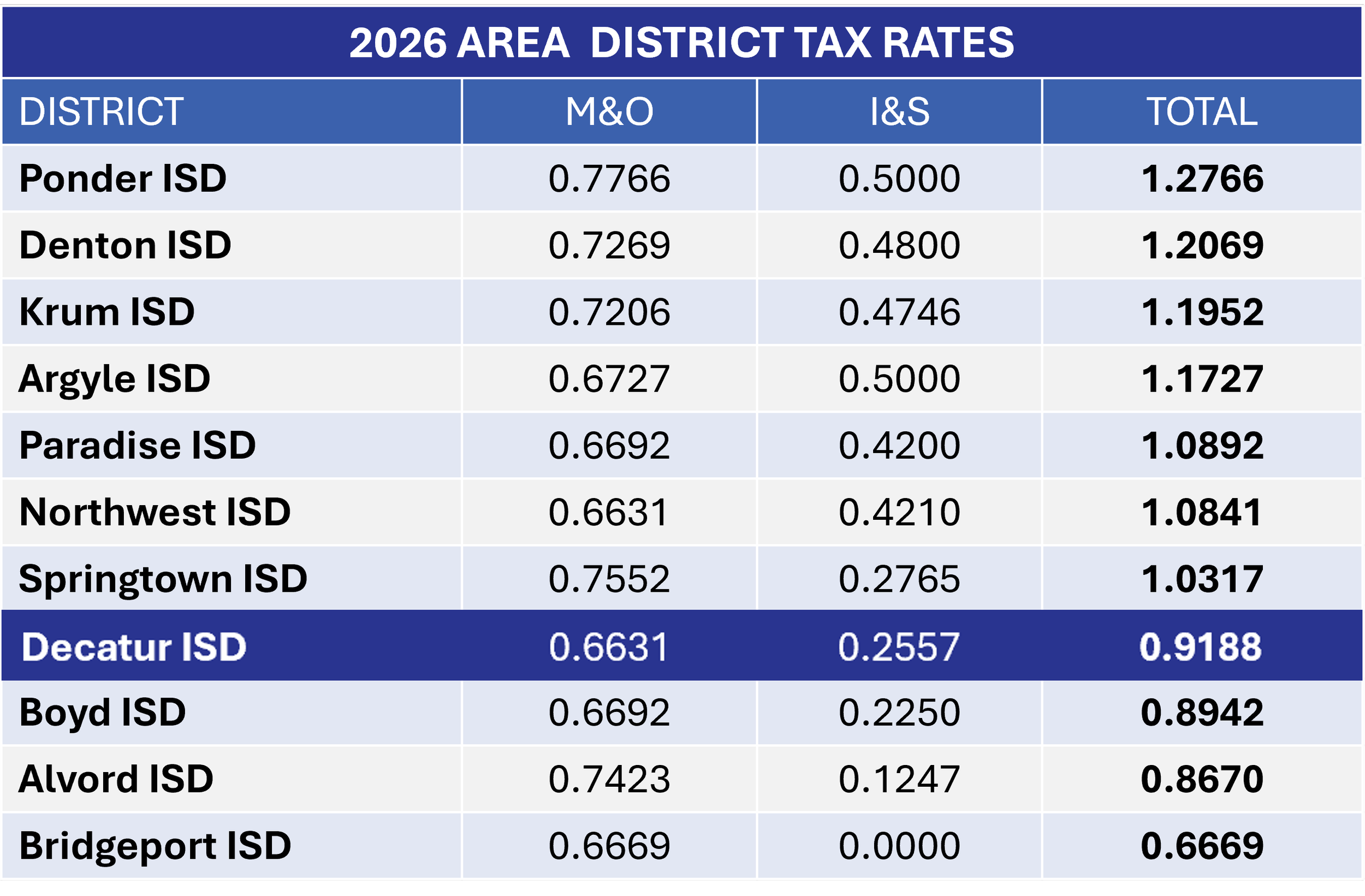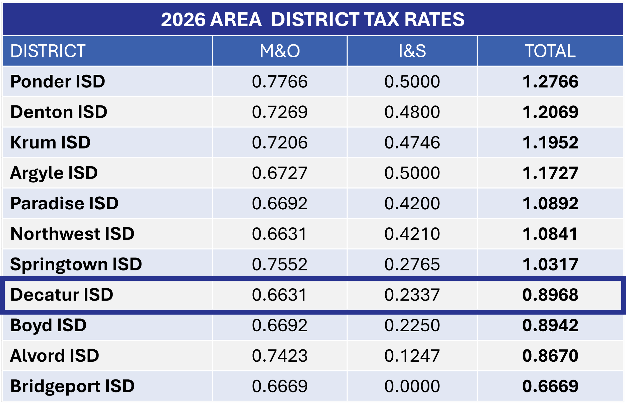 If the bond is approved by voters, Decatur ISD would remain in the same position among current area school district 2026 tax rates.